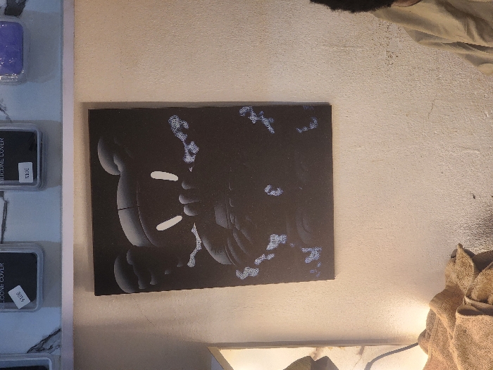 A dark abstract painting hangs on a light beige wall. The artwork features rounded, bulbous shapes primarily in shades of black and gray, with scattered, small white dots or markings that create a sense of depth. It resembles a stylized depiction of intertwined figures. To the left of the painting, a display of small, labeled products is visible. Parts of clothes also appear on the right and upper parts of the image.
