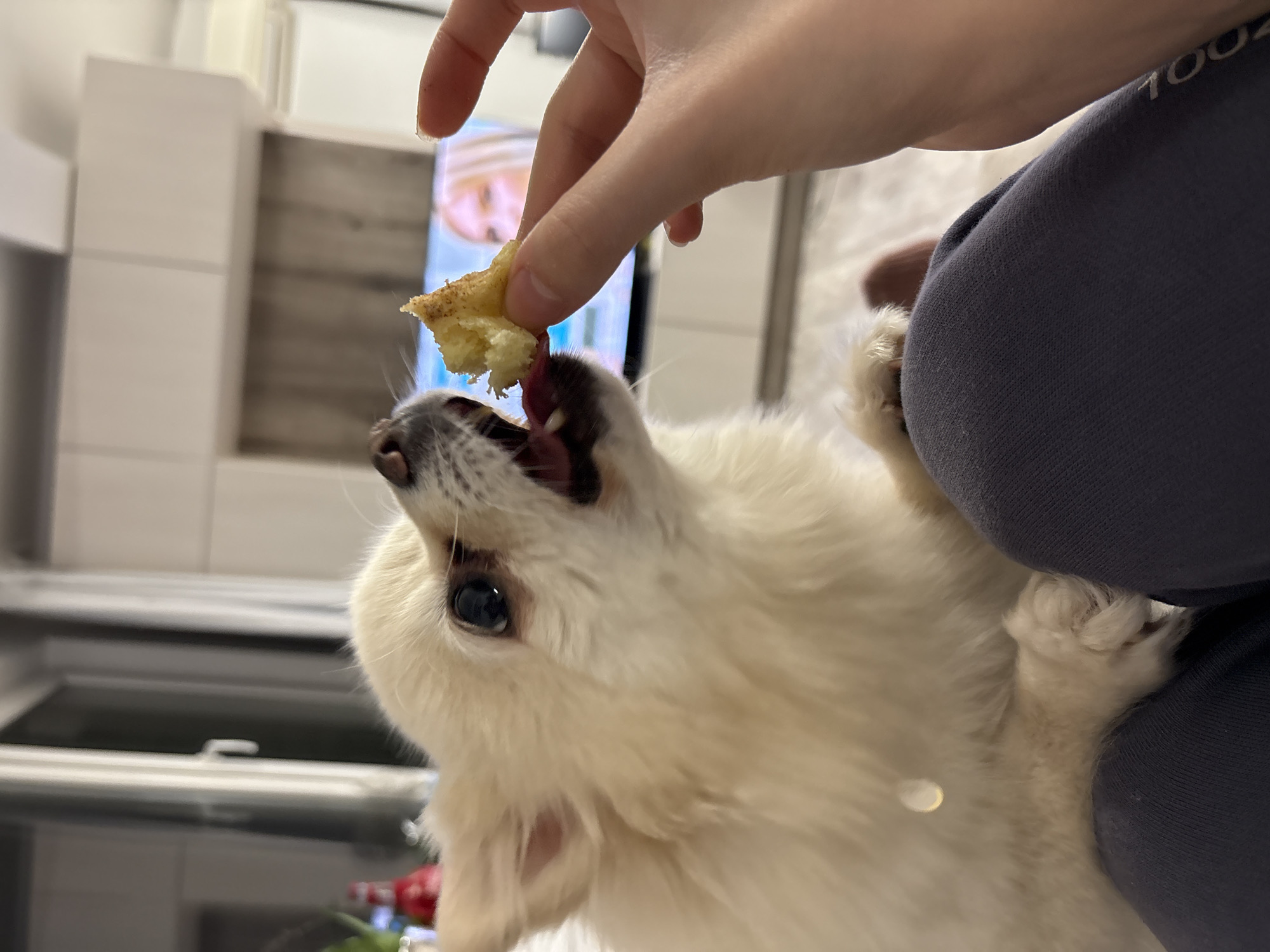 An indoor photograph, reportedly from Sofia, Bulgaria, depicts a cream-furred dog, identified as a small breed such as a Pomeranian, actively consuming a piece of food. The dog is positioned on the lap of an individual, whose lower body is clothed in dark gray sweatpants. A fair-skinned human hand, entering from the right, holds a small, irregularly shaped piece of yellowish-white food with visible brown specks, which the dog is biting with its mouth open and tongue slightly extended. The background reveals a contemporary residential setting. A flat-screen television, positioned on a white media console, displays a blurred image of a blonde female. Above the television, white modular cabinets are mounted on the wall. A white wall-mounted air conditioning unit is visible to the far right. On the left, a tall window or glass door frame with vertical blinds is partially visible. Out-of-focus elements on the far left include a red container and green foliage. The floor surface appears to be a light-colored, possibly shag, rug. The scene is illuminated by artificial interior lighting.