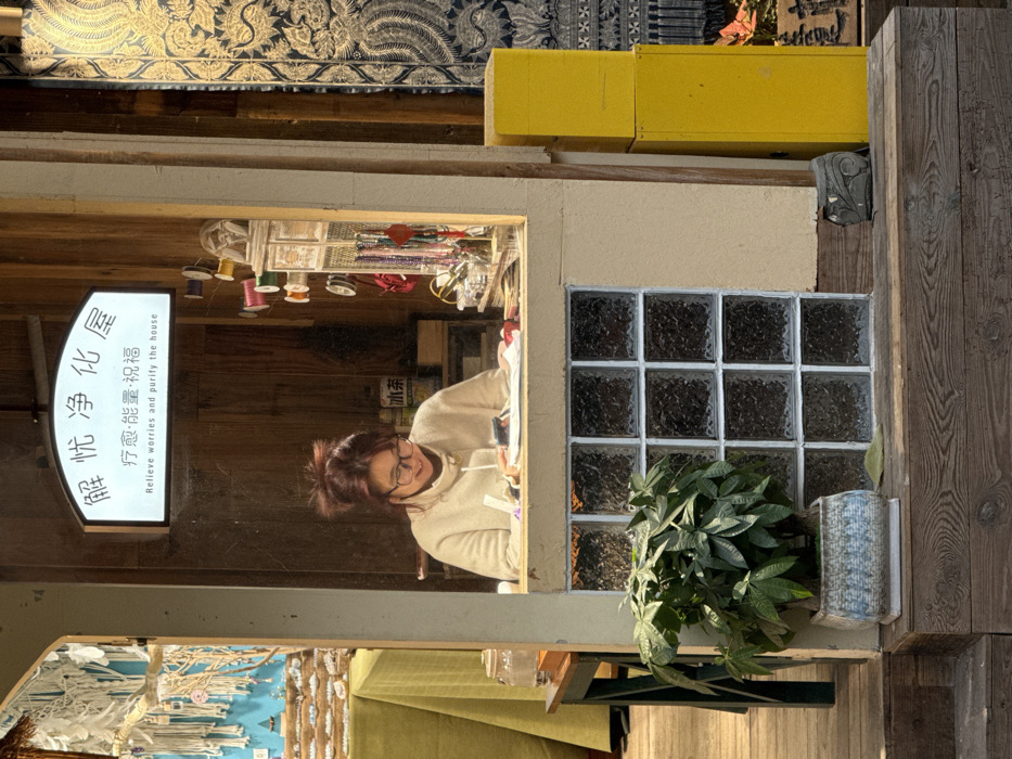 The image displays the exterior of a retail establishment located in Yuzhong District, China, with a view into its interior. A female individual with reddish-brown hair, styled in a messy bun and wearing glasses, is seated inside behind a counter. She wears a light-colored, high-necked long-sleeved top and is looking down at an object on the counter, exhibiting a faint smile. Above the individual, an illuminated sign in Chinese and English reads "解忧净化屋 / 疗愈·能量·祝福 / Relieve worries and purify the house." To her right, a small wooden display cabinet is filled with spools of colored thread, and various necklaces and pendants are exhibited on hooks. A container marked "冰茶" (Iced Tea) is also present. To her left, macrame-style decorations hang against a blue wall, and a table draped in green fabric holds a glass beverage dispenser. The lower exterior section of the shopfront features a beige wall containing a grid of twelve frosted glass blocks. In the immediate foreground, a potted plant with large green leaves rests in a patterned blue and white ceramic pot on a wooden step. To the right, two yellow rectangular boxes are stacked vertically on the ground, with a small, dark-colored decorative object positioned on the wooden step beside them. The ground leading to the shop is constructed from wooden planks or steps.