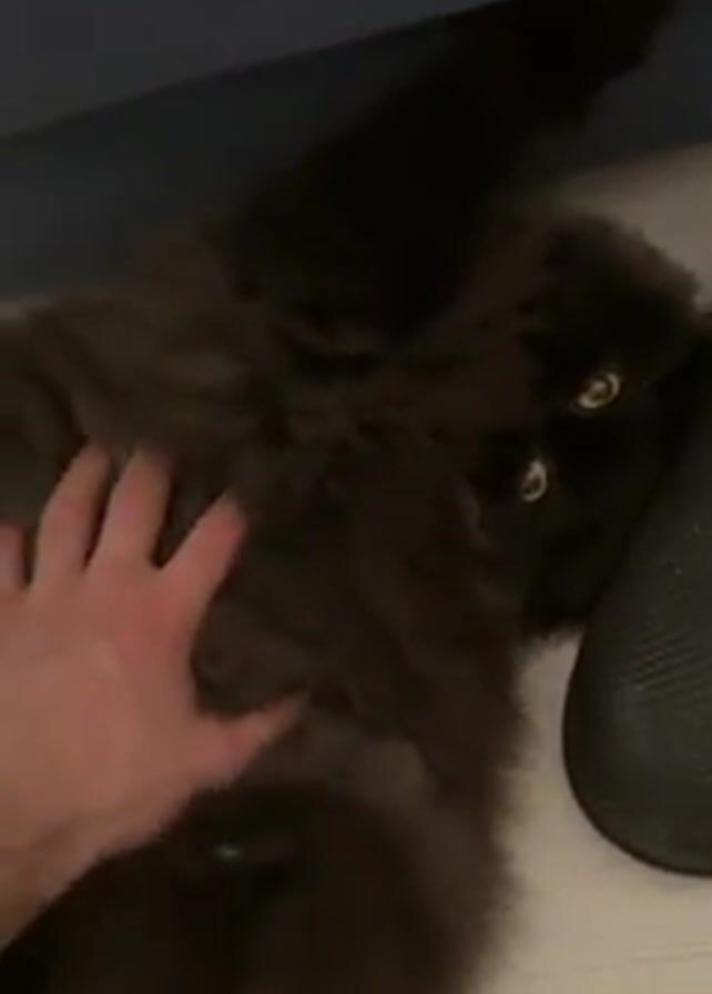 A hand pets a long-haired dark gray cat lying on its back on a gray surface next to a black object. The cat meows and looks at the camera with yellow eyes. The hand continues to pet the cat's belly.