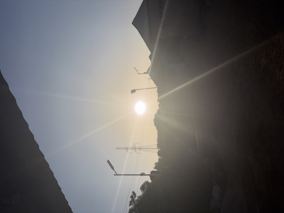 The sun shines brightly in a pale sky, obscured by glare. Several streetlights line a hazy horizon punctuated by an electrical tower. Part of a building and a dark, imposing hill or structure frame the image's upper and lower edges, respectively, creating a sense of being hemmed in by the landscape and man-made structures. The light obscures details, giving the scene an ethereal, almost surreal quality.