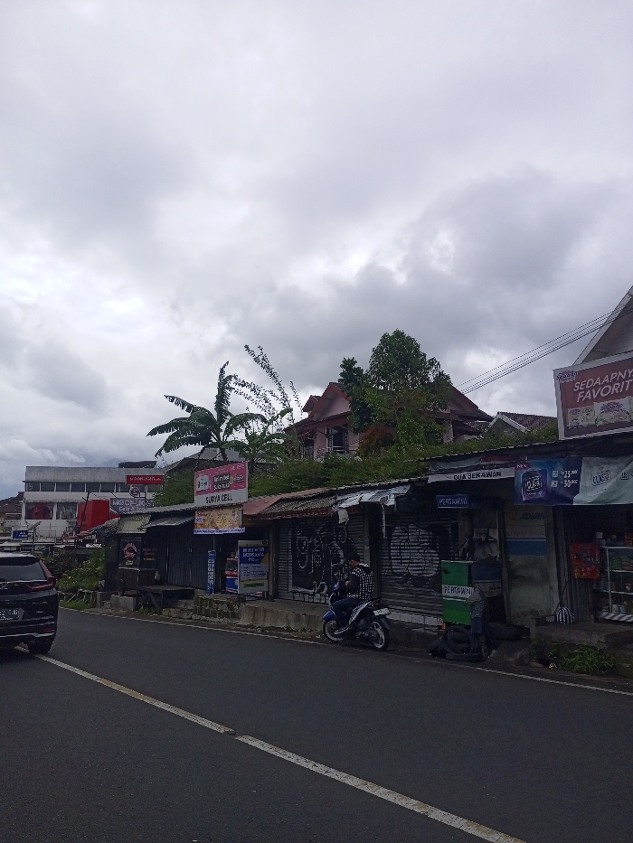 A street scene under a cloudy sky features a row of small shops, some with closed metal shutters covered in graffiti. A person sits on a blue and white scooter parked by the curb. Signage, including "SURYA CELL" and "SEDAAPNYA FAVORIT," is visible. A dark-colored SUV drives on the road. Buildings and lush greenery are seen in the background, partially obscuring a pinkish-red house. Overhead power lines stretch across the scene.
