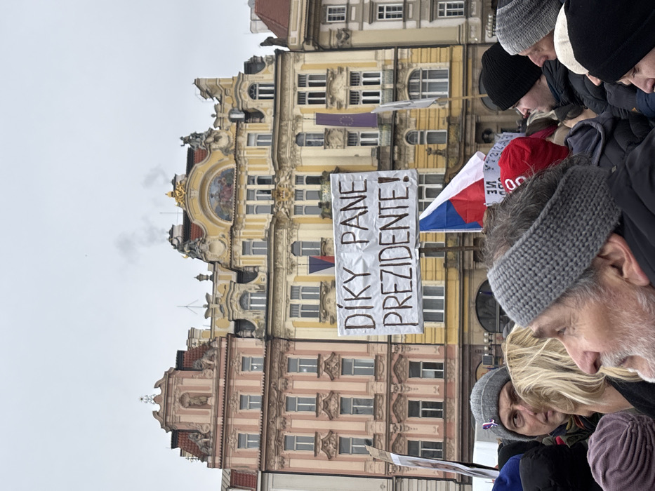 The image presents a crowded public gathering in the Old Town Square of Prague, Czechia, under an overcast sky. In the midground, a white rectangular sign, held aloft, prominently displays the hand-drawn brown text "DÍKY PANE PREZIDENTE!", translating to "THANK YOU, MR. PRESIDENT!". Below this sign, a Czech national flag is partially visible. The foreground is densely packed with the heads and shoulders of numerous individuals, predominantly wearing winter attire such as beanies and knitted headbands. The background is dominated by two ornate, multi-story historic buildings. The building on the left is pinkish-red with multiple windows and a decorated gable featuring a central statue and flanking lion sculptures. The central-right building is yellow, highly decorated with intricate details, gold accents on its roofline, an arched fresco above a central window, and emits light grey smoke from two distinct chimney stacks.