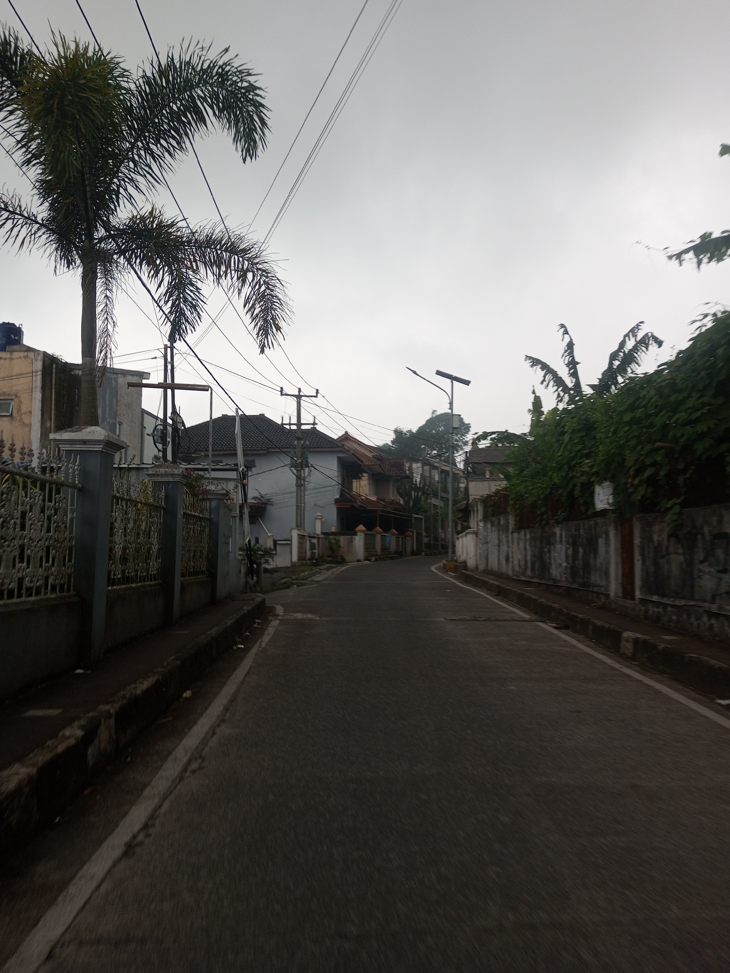 The scene depicts a quiet, residential street in Kan Beit, Myanmar, under an overcast sky. A dark asphalt road, slightly blurred from motion, occupies the foreground and center, curving gently to the right in the distance. A faded white line marks the left edge of the road. On the left, a tall Areca palm tree with dense, drooping fronds stands prominently, partially obscuring a decorative, dark metal fence with concrete pillars. Behind the fence, several multi-story houses with varying architectural styles and tiled or flat roofs are visible. Multiple utility poles, laden with a dense network of black overhead electrical and communication wires, line this side of the street. A narrow concrete curb runs alongside the road, separating it from the properties. On the right, a long, weathered concrete wall, showing signs of staining and possible moss growth, extends into the distance. Dense green foliage, including discernible banana leaves and other bushes, overhangs this wall, partially concealing residential structures behind it. A modern streetlight, topped with a solar panel, is positioned mid-frame on this side. Another concrete curb delineates the road from the wall. The sky is a uniform light gray, indicating heavy cloud cover. No individuals, vehicles, or specific actions are discernible within the frame.