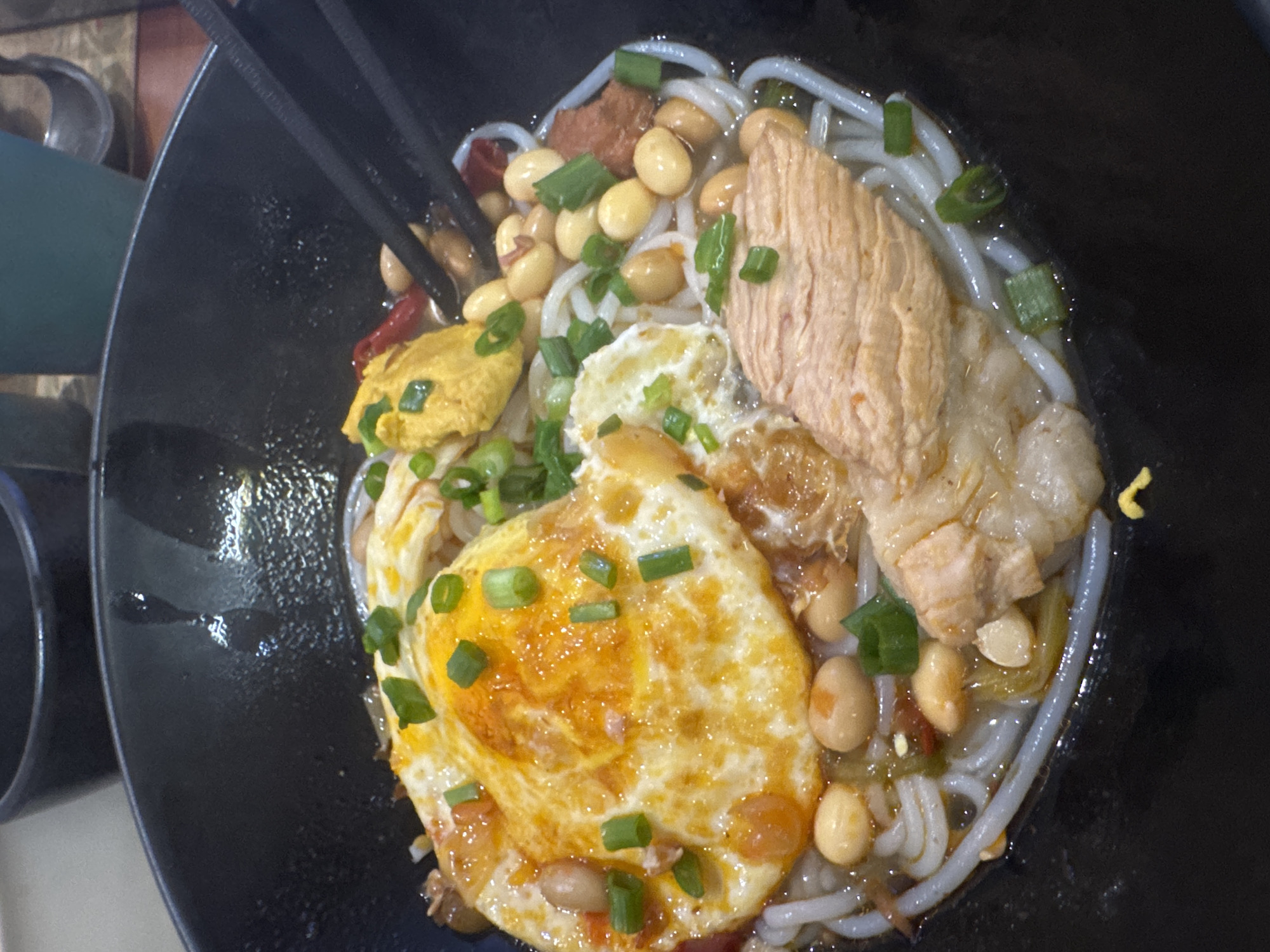 A close-up, overhead view depicts a prepared meal served in a black ceramic bowl. The dish contains white, round rice noodles submerged in a dark liquid or broth. Centrally placed is a fried egg with a prominent golden-orange yolk and crispy white edges, while a smaller piece of cooked egg is visible in the upper right. Scattered throughout the noodles are numerous light-colored legumes, resembling peanuts or soybeans, along with pieces of light-brown cooked meat and smaller, darker red meat fragments. The entire dish is generously garnished with chopped green onions and contains several red chili pieces. A pair of black chopsticks is inserted into the upper right portion of the bowl, suggesting active consumption. The blurred background shows a dark-colored cup or bowl to the upper left and a teal-colored mug with a handle to the upper right, resting on a light-colored surface. The scene is located in Wulingyuan, China.