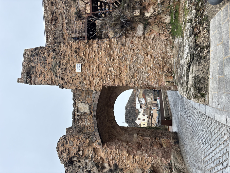 - "The image displays a weathered stone archway, identified by a white sign with blue text reading "CASTILLO SIGLO XIII" (Castle 13th Century), indicating its location at the entrance to the historic castle area in Cuenca, Spain" by FM-E1hwL2, licensed under CC BY 4.0