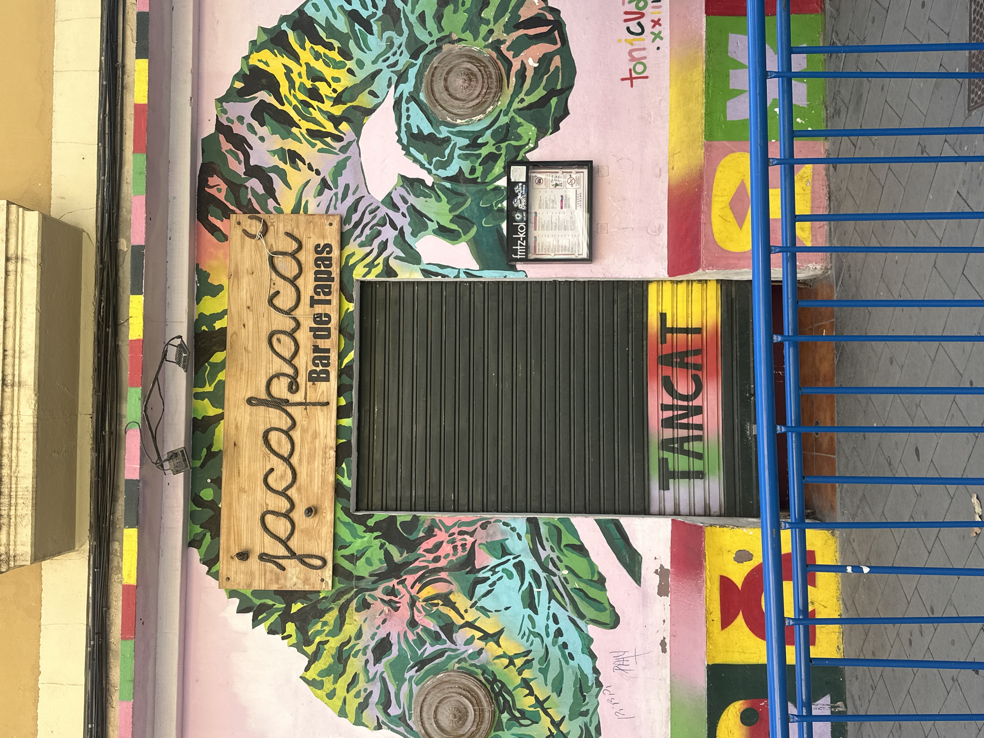 The image displays the exterior of "jacapaca Bar de Tapas," located at C. del Castaños, 40, 03001 Alicante, Spain, viewed from street level during daylight. The establishment is closed, indicated by a lowered dark green metal roller shutter covering the entrance and the word "TANCAT" (Catalan for "closed") spray-painted in black with red and yellow accents on its lower section. The building's facade is primarily painted pink and features a large, abstract mural of a chameleon with patterns in green, yellow, light blue, pink, and purple. Two circular, corroded metal fixtures are integrated into the chameleon's design on the wall. Above the mural, a horizontal stripe of alternating colored rectangles (pink, green, red, yellow, black, pink, green) runs beneath a beige upper facade. Below the mural, at street level, is another horizontal band of graffiti with geometric shapes and partial letters in red, yellow, green, and purple. Additional graffiti text, "PAU" and "12:13:P1," is visible on the lower left, and "tonicvua .xxIII." on the lower right. A rustic wooden sign, bearing "jacapaca" in a dark, rope-like script and "Bar de Tapas" in smaller black text, is affixed above the shuttered entrance. Two black-cased floodlights are mounted above this wooden sign. To the right of the shutter, a black-framed, clear display case containing a menu, prominently featuring "fritz-kola," is attached to the wall. In the foreground, a bright blue metal railing, consisting of two horizontal bars and numerous vertical balusters, traverses the bottom third of the image. The sidewalk beyond the railing is paved with light gray rectangular tiles, on which a few dried leaves are visible. No individuals are present in the scene.
