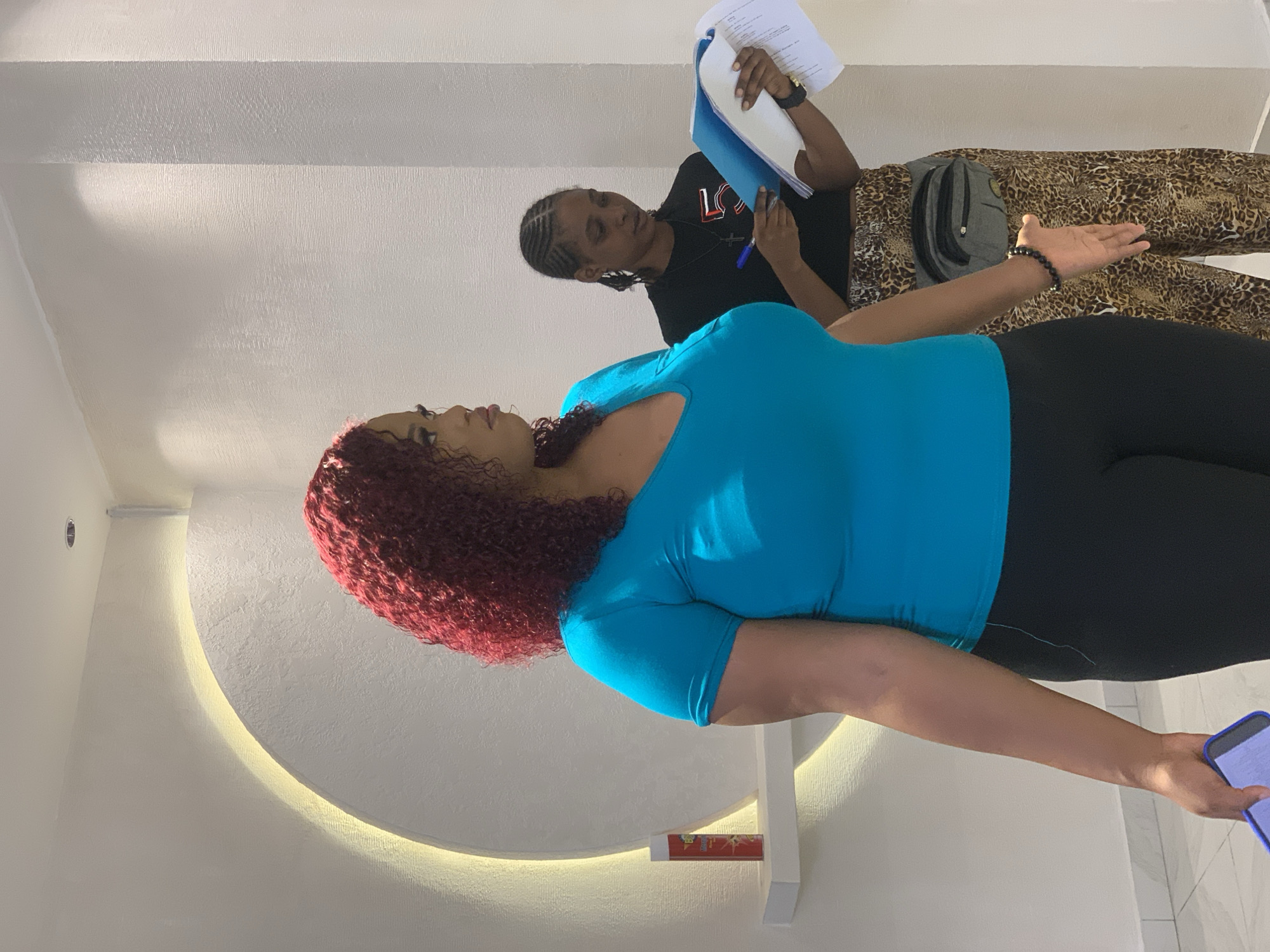 The image depicts an indoor scene in the city of Moba, Nigeria, featuring two adult females. In the foreground, a light-skinned woman with bright red, curly hair and wearing a teal V-neck short-sleeved top and black leggings stands, looking towards the right. She holds a blue object, likely a smartphone, in her right hand and wears a black beaded bracelet on her right wrist. Behind her, a darker-skinned woman with dark braided hair, wearing a black t-shirt with a white "5" and leopard-print pants, is engaged in reviewing documents. She holds an open blue binder with white papers in her left hand and a blue pen in her right hand. She wears a dark wristband on her left wrist, a cross pendant necklace, and a gray fanny pack around her waist. The background features light-colored, textured walls. A prominent circular wall niche with indirect warm lighting along its inner rim is visible on the left, beneath which a small white floating shelf holds a red and white aerosol can with partially legible labeling. The ceiling contains a recessed spotlight, and the floor is a light-colored tile.