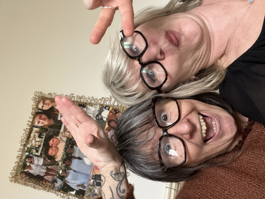 The image displays two adult females in a close-up, indoor setting within Montélimar, France. The subject on the left, characterized by short grey and dark hair and tortoise-shell spectacles, exhibits a wide-mouthed, animated expression revealing her teeth. Her left arm is elevated with the palm facing the viewer, exposing a dark-inked tattoo on her forearm. She wears a brown, textured garment. The subject on the right, possessing short blonde and grey hair and tortoise-shell spectacles, presents a playfully distorted facial expression with a partially extended tongue. Her right hand is raised, forming a 'peace' gesture with two fingers. She is attired in a dark top, accessorized with a necklace featuring a small, circular pendant. Positioned centrally in the background, mounted on a plain, light-colored wall, is a rectangular framed photo collage. The frame is gold-toned and decoratively braided, encompassing multiple photographs predominantly featuring women and children. The environment appears to be a domestic interior with artificial illumination.