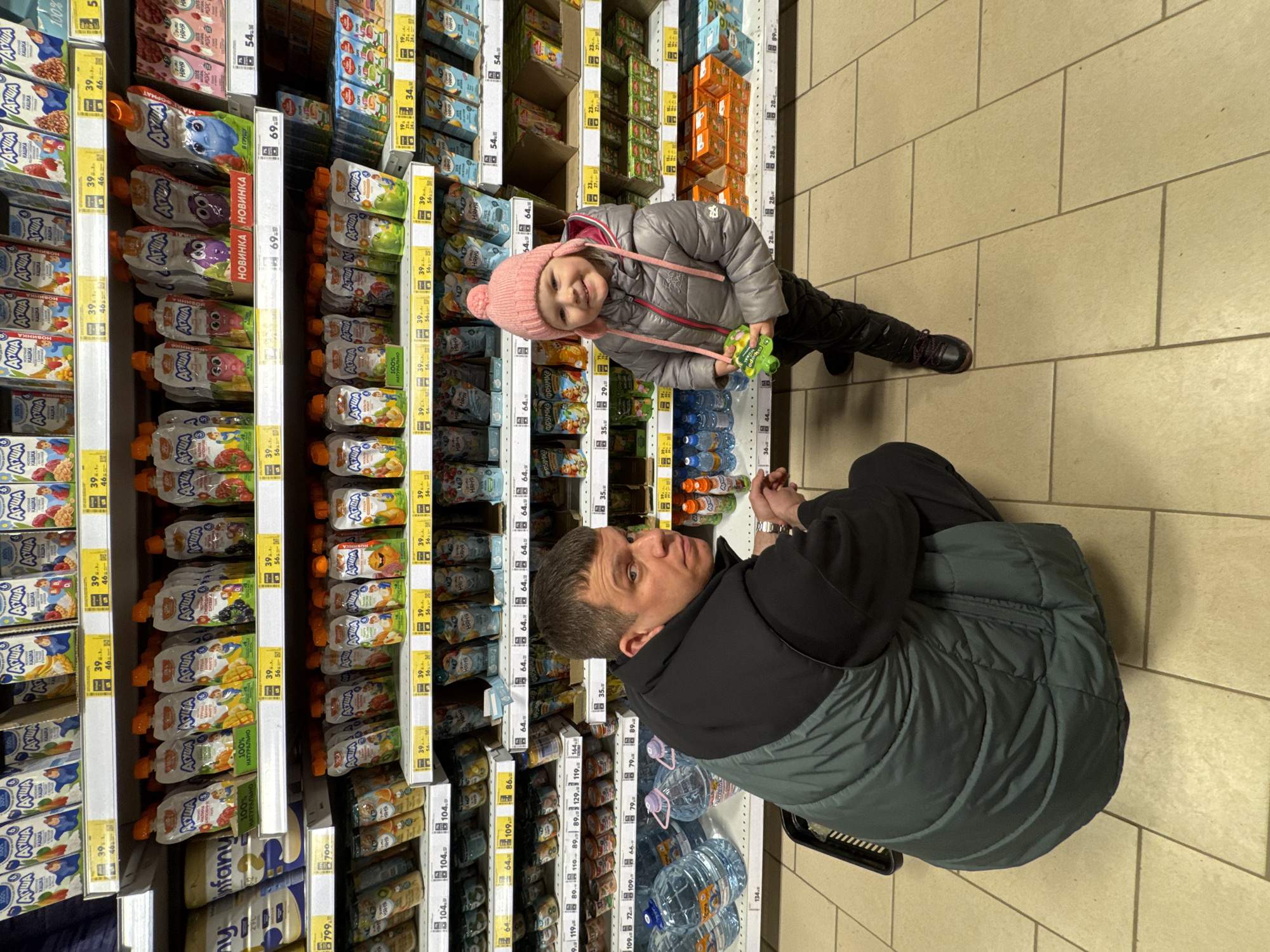 The image captures a scene inside a grocery store, likely in Горный, Russia based on the product labeling. A man is squatting down in the aisle, looking up towards the camera. He is wearing a dark-colored jacket over a green puffer vest. Next to him, a small child wearing a pink knit hat and a silver puffer jacket is standing and holding a green toy. The child is also looking at the camera. The background is filled with shelves stocked with various food products, primarily baby food pouches and bottled water. Price tags are visible on the shelves in Russian currency. The floor is tiled.