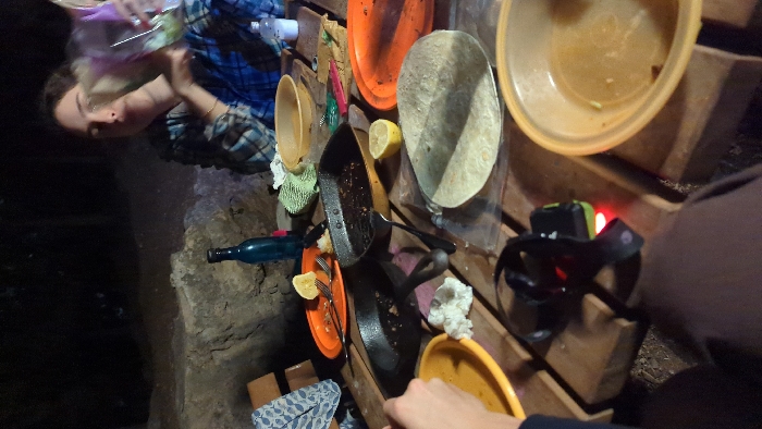 The image displays a nocturnal outdoor meal scene in Modiin-Maccabim-Reut, Israel. A wooden picnic table is central, laden with items from a recently consumed meal. Two individuals are partially visible. On the right, a female subject with dark hair, wearing a blue and white plaid shirt, holds a clear plastic bag containing leafy greens; her face is partially obscured by motion blur. In the lower-left foreground, a hand holds an empty yellow plastic plate, belonging to an unseen individual. Objects on the table include two dark frying pans with food residue, two orange plastic plates containing remnants (one with a corn cob piece, a fork, and a knife), an orange plastic bowl with liquid residue, a white tortilla on a clear plastic sheet, a blue glass bottle, two half-lemons, a green textured cloth, a small white plastic bottle, and a pile of white foodstuff. A black headlamp, exhibiting a red indicator light, rests on the table. The background reveals a dimly lit, rough rock formation, confirming a natural, outdoor environment at night. The ground beneath the table appears to be dark earth.