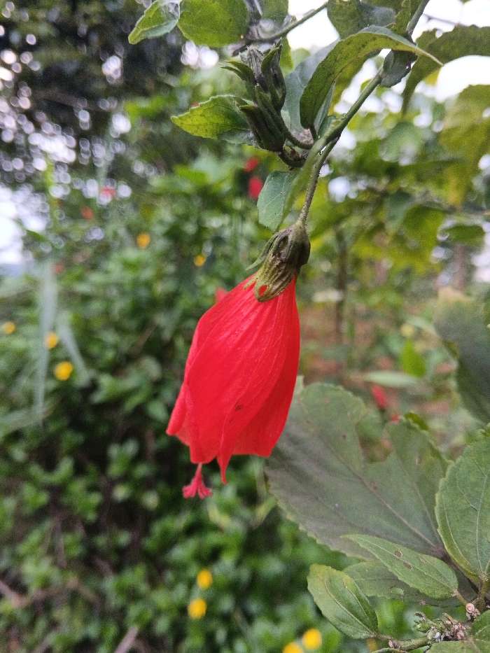 - "The image depicts a vibrant red Sleeping Hibiscus (Malvaviscus arboreus) flower, also known as Turk's cap or cardinal flower, suspended downwards from a slender green stem" by FM-6nzjy2, licensed under CC BY 4.0