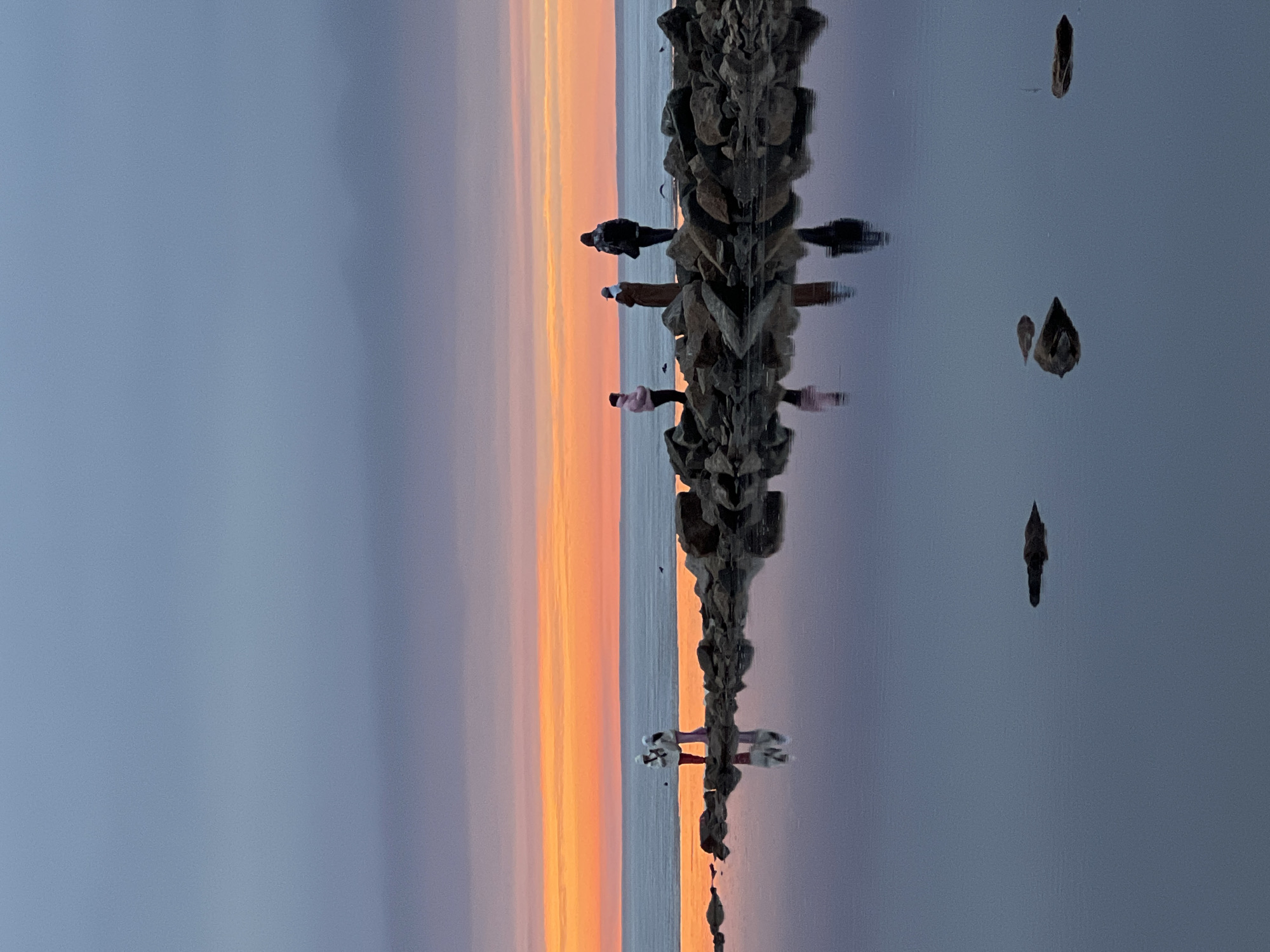The image depicts a sunset scene in Sestroretsk, Russia, featuring a rocky breakwater extending into a body of water. Several individuals are present on the breakwater; they are standing and appear to be watching the sunset. The sky transitions from a deep orange to a muted gray-blue, reflecting on the water's surface. Scattered rocks are also visible in the water. The image orientation is rotated 90 degrees counterclockwise.