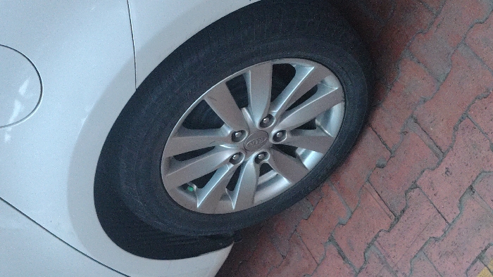 - "The image presents a forensic close-up of the rear driver-side wheel and lower quarter panel of a stationary white Kia passenger vehicle" by FM-jKAxr1, licensed under CC BY 4.0