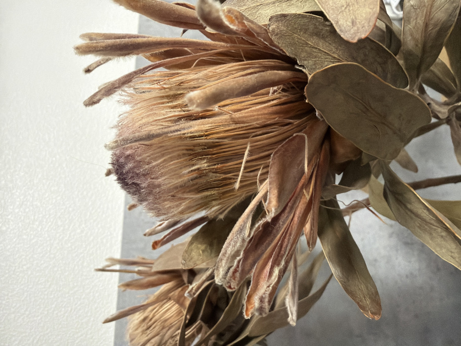 A close-up shows a dried floral arrangement dominated by a protea flower head with feathery, light brown bracts