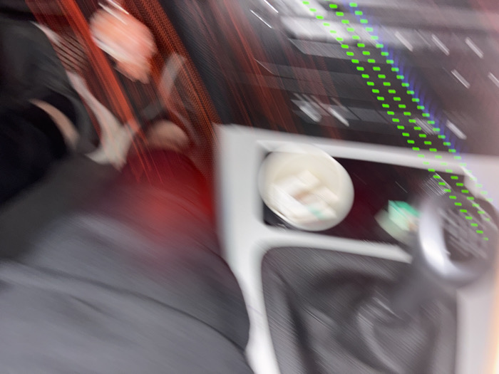The scene is an interior view of a vehicle, located in Kostinbrod, Bulgaria. The image is heavily motion-blurred, indicating movement or a rapid capture. The perspective is from an elevated position looking down towards the vehicle's center console and floor area. On the left side of the foreground, a dark grey fabric, consistent with clothing or upholstery, is visible. Beneath it, a blurred red area suggests an interior surface or reflection. In the central and right midground, a white cup or container is secured in a console recess, containing several indistinct white rectangular objects. Adjacent to the cup, a small green object with a slight sheen is present. A manual gear shift lever, featuring a metallic-toned, possibly silver, knob, extends from a dark, textured boot in the lower right portion of the image. The immediate surrounding console material is a light grey plastic. The background shows a dashboard or control panel area with dark, indistinct buttons. Overlaying this area are multiple diagonal rows of uniformly spaced, distinct green square-shaped dots, which appear to be emitted or reflected light. Additional reddish light streaks are visible across the background. No discernible individuals are present within the frame.