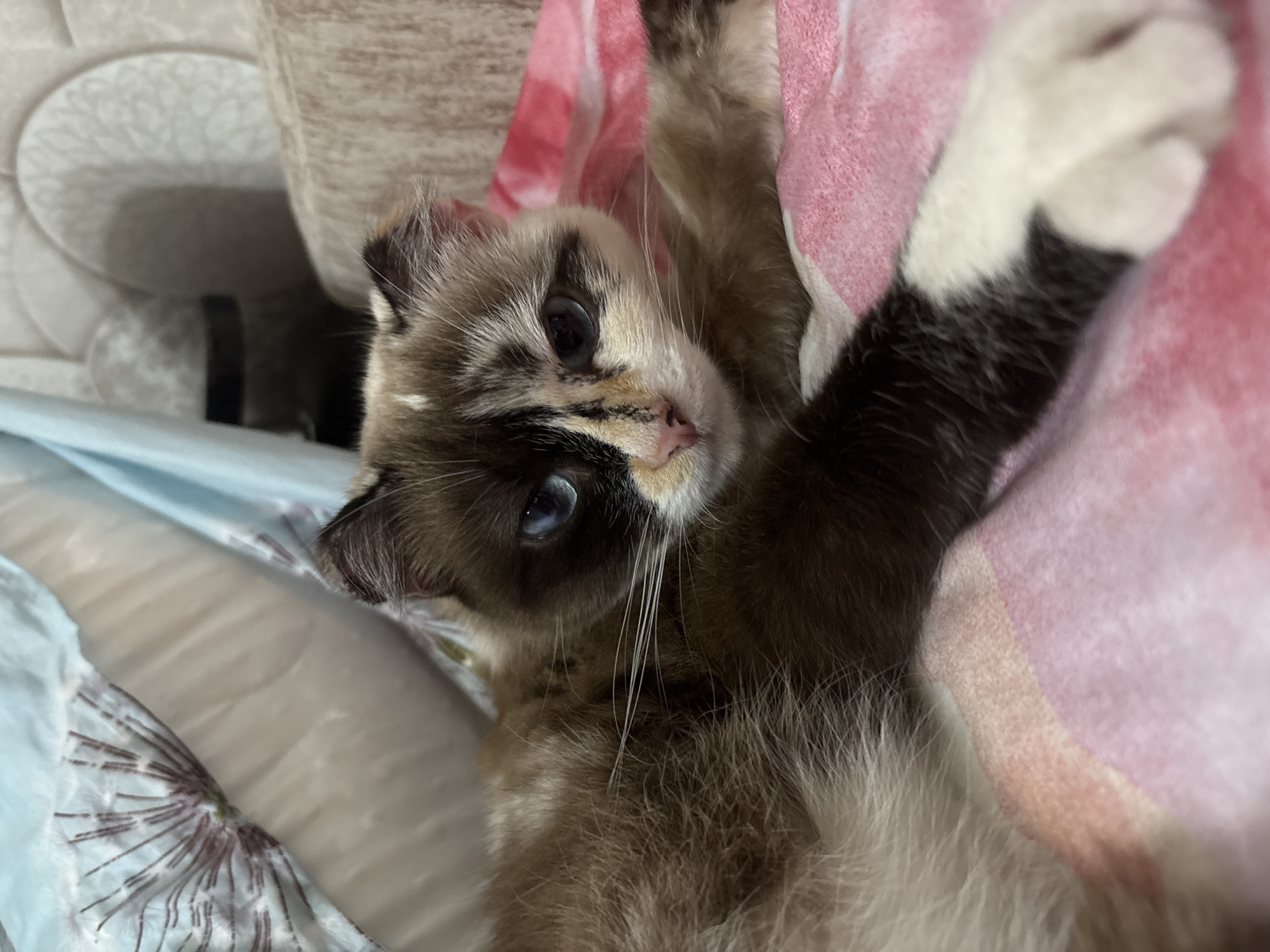 A cat with a brown and white coat and blue eyes lies on its back, with its front paws raised. One paw is mostly white, the other is brown and white. The cat is lying on a bed with a light blue and white patterned sheet and a pink blanket or cloth. The cat's face is dark brown and white, with a pink nose. The background includes a white wicker basket or container. The location is unknown and not verifiable as Osa, Russia.