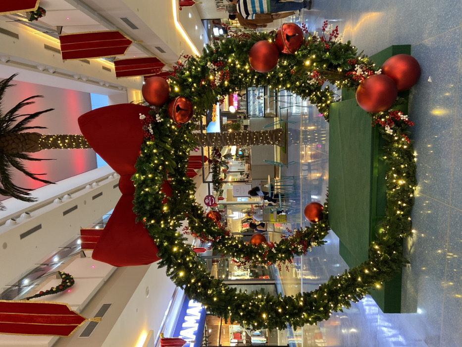 A festive Christmas display in a shopping mall features a large circular garland adorned with red ornaments, bells, and twinkling lights