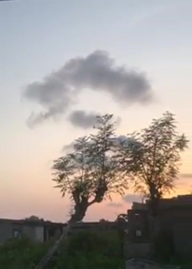 sunset scene. In the foreground are trees and some overgrown vegetation, as well as the remains of a brick structure. In the distance, there are buildings, some with roofs. The sky is a gradient of colors with some clouds. There are also power lines visible. A few people are walking in the background. The overall impression is one of a peaceful, but slightly rundown, rural area at dusk.