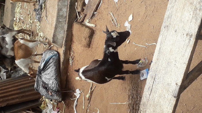 This image, captured in Awada, Nigeria, depicts an outdoor scene characterized by a reddish-brown dirt ground with scattered debris