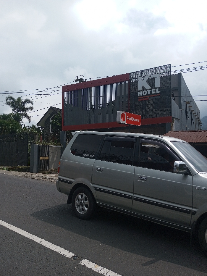 A silver minivan travels along a paved road next to a gray building with a black and red sign reading “KT HOTEL.” A smaller red and white sign with “RedDoorz” is displayed below. Across the road, behind a black fence, is a small house with a gable roof, partially obscured by trees. The sky is overcast.