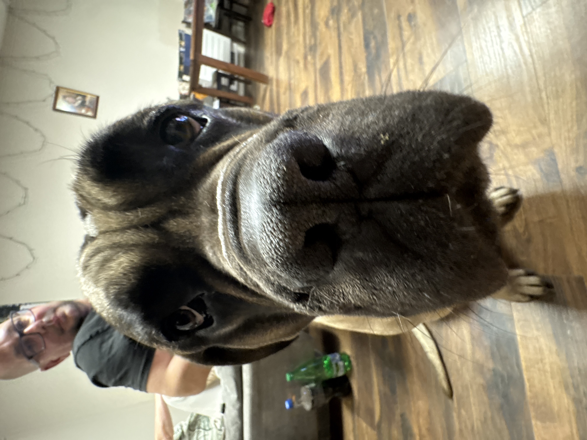 - "An indoor scene in Strashimirovo, Bulgaria, features a large, dark brindle dog, likely a Mastiff, occupying the majority of the foreground in a close-up, low-angle shot" by FM-lNrs52, licensed under CC BY 4.0