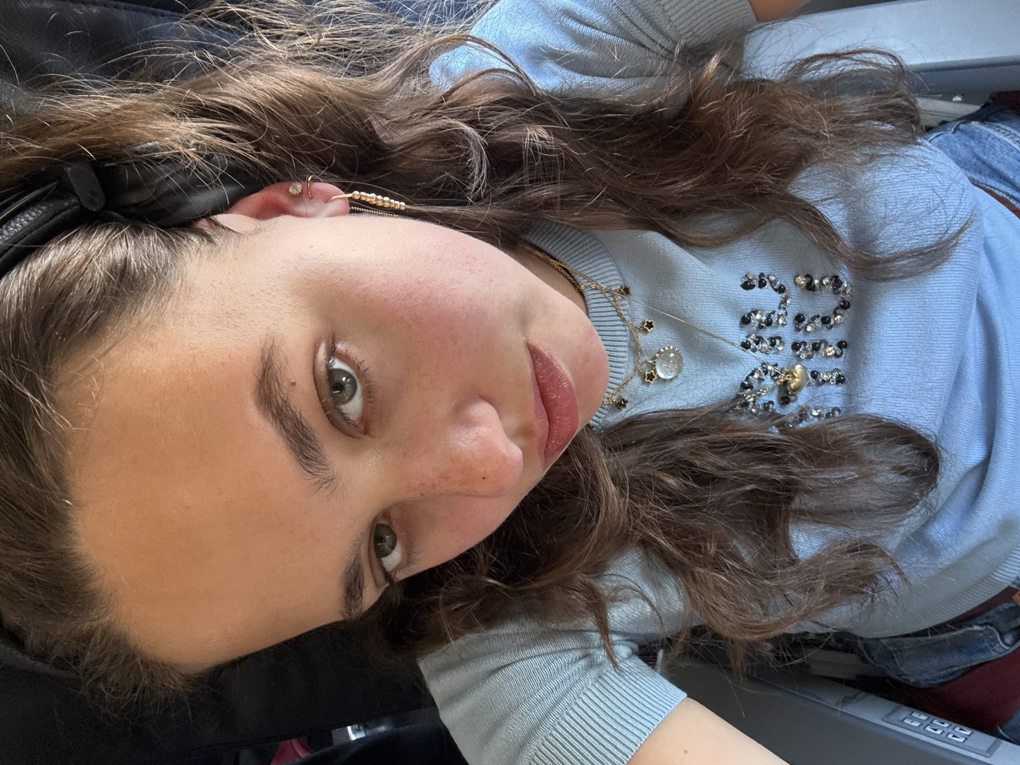 A young woman with brown hair is looking at the camera from a low angle. She is wearing a light blue sweater with beaded designs on the front and layered necklaces. She has multiple piercings in her ear and is wearing black headphones. The background appears to be an airplane interior, with a control panel visible in the lower right corner. The image does not contain sufficient information to infer the location is the city of Peschiera Borromeo, Italy.