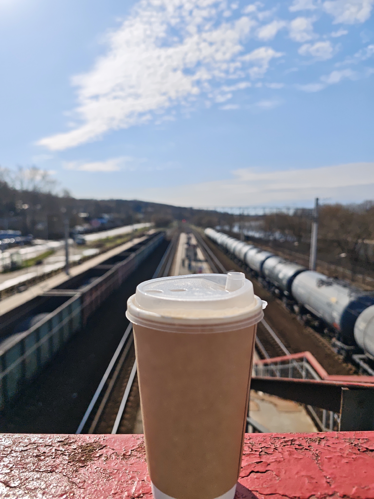 A medium-shot photograph shows a full paper coffee cup with a plastic lid resting on a red, weathered surface with peeling paint. In the blurred background is a railway station in Yakhroma, Russia. Several sets of railroad tracks run horizontally across the image, with freight train cars visible on multiple tracks. Bare trees border the edges of the scene, with a blue sky and scattered white clouds visible above. The station appears to be a depot for freight, with various industrial buildings and train cars. The perspective is from an elevated position, possibly a bridge overlooking the tracks. The day is clear and sunny.