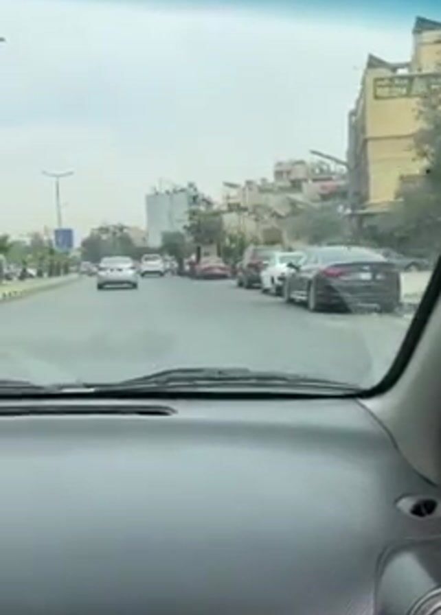 view from inside a car driving on a city street. The road is paved and divided by a median. Several cars are on the road, both moving and parked. Buildings are visible on either side of the street. People are walking near the sidewalk. The sky is overcast. The camera is stable and focused on the road ahead.