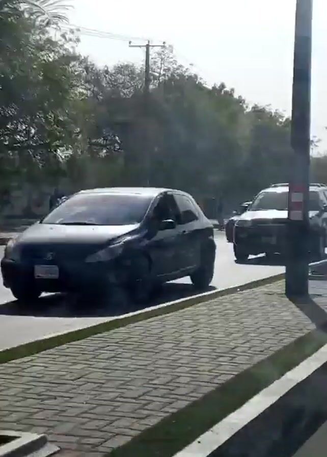 street scene with various vehicles passing by. There are cars, a minivan, a motorbike, and a yellow autorickshaw driving on the road. The camera is likely inside a moving vehicle, observing the traffic from the side of the road. A sidewalk made of gray patterned bricks runs parallel to the road, lined with small, square planters with small trees. Trees are also visible on the other side of the road. The sky is bright and the weather appears sunny.