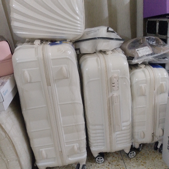 The image displays an indoor scene dominated by multiple pieces of new, white luggage, consistent with a retail display or storage area