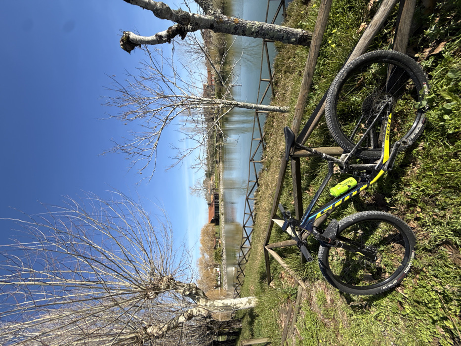 An outdoor scene in Cantanhede, Portugal, depicts a tranquil lake environment under a clear blue sky. In the foreground, a dark blue and yellow Scott full-suspension mountain bike with a bright yellow water bottle rests on its side, leaning against a rustic wooden log fence. The bike is positioned on a grassy bank with scattered dried leaves. Beyond the fence, a calm lake reflects the sky and distant elements. On the far side of the lake, several buildings with reddish-brown tiled roofs are visible amidst a mix of deciduous trees, many bare of leaves, and some evergreen foliage. Numerous bare-branched deciduous trees, some with gnarled trunks, line the left side and extend into the midground. The scene is brightly lit by natural sunlight, casting distinct shadows. No people are present.