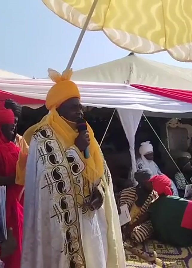 gathering of people, possibly for a ceremony or event. The scene is outdoors, under large white tents decorated with red and white fabric. Several individuals are wearing traditional clothing and headdresses. In the foreground, a man is speaking into a microphone, covered by a large, wavy-patterned umbrella. Others are standing around him, and many more people are seated under the tent. Some are holding up their phones, apparently recording the event.