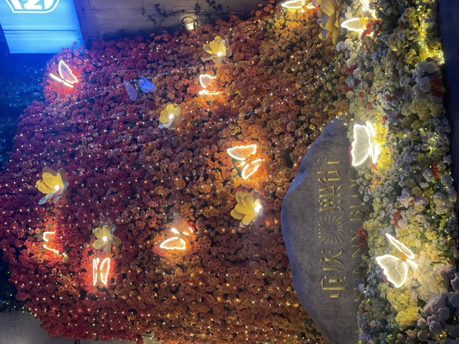 - "The image displays an illuminated outdoor decorative wall and ground display at night, located in the Chongqing High-tech Zone, Sunny Block (熙街), China" by FM-QQglM2, licensed under CC BY 4.0