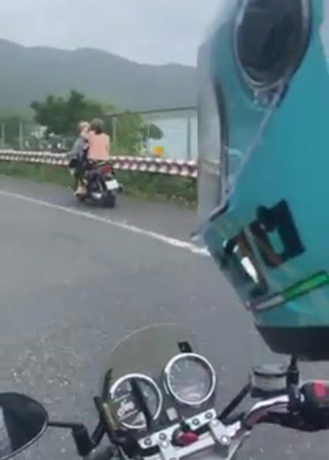 The video is shot from the perspective of a person riding a motorcycle on a road with mountains in the background. The road appears to be wet, and the sky is overcast, suggesting it might be raining or has recently rained. The motorcycle has a red gas tank and a small windscreen. The rider is wearing a turquoise helmet with a white logo. In the first few seconds, another motorcycle with two people on it is visible on the opposite side of the road. The motorcycle rider then overtakes it, and it is seen again a short distance ahead. The scenery consists of green vegetation along the roadside and the mountains in the distance.