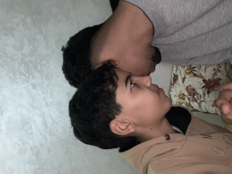A father and son are close together, appearing to be in a cozy indoor setting. The son, with dark hair, looks upwards. The father, also with dark hair and a light beard, is positioned behind him. They seem to be lying down on a cushioned surface, with a patterned pillow visible. The son wears a beige jacket, while the father wears a gray shirt. The wallpaper has a textured pattern.