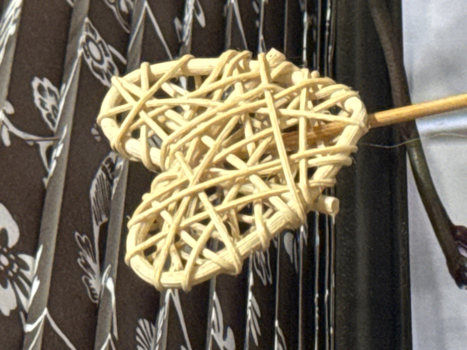 The image depicts a close-up scene located in Lovech, Bulgaria. A woven wicker heart decoration is centrally positioned, constructed from light-toned natural fibers, exhibiting an intricate, open lattice pattern. It is affixed to a slender, light-colored wooden dowel extending vertically downwards. The upper background reveals a dark brown textile with a repeating white floral-foliage motif, consistent with a folded outdoor umbrella or awning. A dark, horizontal structural element separates the textile from a blurred, lighter area in the lower portion of the frame. A dark, curved organic or structural element is partially visible in the bottom-left foreground. No persons are present in the depicted scene.