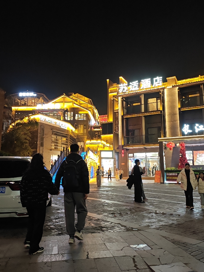 The image depicts a nighttime scene in a pedestrian area within Nan'an District, China, characterized by illuminated traditional Chinese-style buildings. The sky is dark, indicating a lack of natural light. In the foreground, a couple walks away from the camera, holding hands. The person on the left wears a dark, patterned long-sleeved top and dark pants, with white-soled sneakers. The person on the right wears a dark puffer jacket, grey sweatpants, white sneakers, and a black backpack. To their immediate left, the rear section of a white SUV is visible, featuring a blue license plate partially displaying "P98". The mid-ground is a paved pedestrian area. Towards the center-right, an individual dressed in dark clothing stands facing generally right. Further right, a person in a light-colored puffer jacket and dark pants walks alongside a child, also in a light puffer jacket, both moving towards the right. Several other individuals are visible in the background, some near storefronts and others ascending or descending a staircase. The background is dominated by two primary buildings. The building on the left features multiple levels with traditional Chinese roofs and is extensively illuminated with warm yellow lights. A sign reading "SU HOTEL" is visible on its lower facade, with additional Chinese characters above it. A prominent staircase, illuminated with blue lights, ascends towards this building from the pedestrian level. The building on the right is a multi-story structure also featuring traditional architectural elements and warm yellow lighting. A large, glowing sign on its upper facade displays Chinese characters, "苏适酒店" (Su Shi Jiu Dian), identifying it as a hotel. Below this, another sign reads "长江" (Chang Jiang). This building's ground level features glass storefronts, and red lanterns hang as decorative elements near its entrance. Several street signs or advertisements stand on the pavement in front of this building. The ground consists of patterned paving slabs, with some visible cracks.