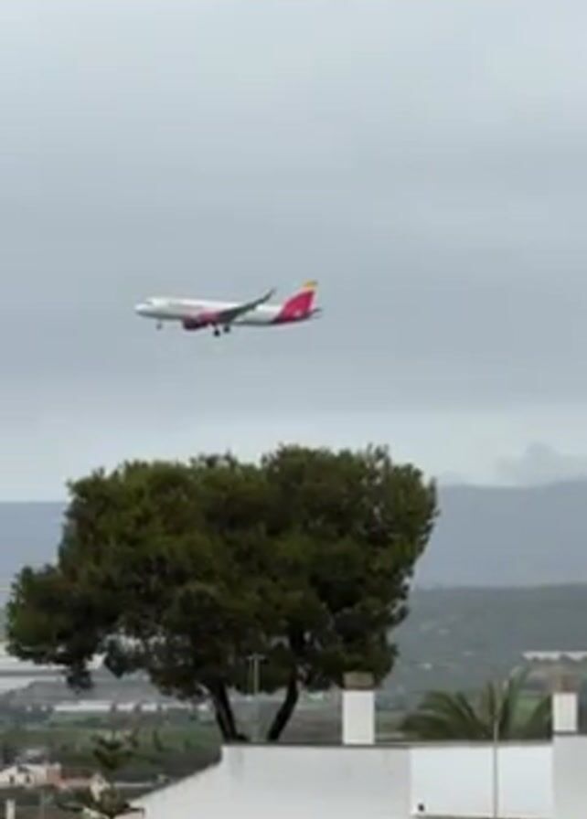 passenger plane in the sky above a landscape. The plane is white with red and yellow markings and is descending, presumably for landing. The background includes trees, buildings, and distant mountains under a cloudy sky. The camera follows the plane's descent, adjusting its position to keep the aircraft in frame.