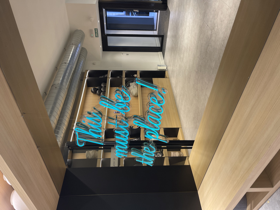 An interior shot depicts a commercial or public establishment in Madrid, Spain. In the mid-ground, a bright turquoise neon sign, reading "This must be the place!" in cursive script, is suspended by thin wires. Below this, a light wooden counter with a reflective metallic strip spans the lower portion of the frame. Behind the neon sign, a shelving unit with light wooden compartments and dark vertical dividers displays various items, including stacked white ceramic objects, black spherical objects, and white soft bags. A partial reflection of "JOY BY" is visible on a dark surface to the left. The ceiling features exposed metallic ventilation ducts. To the right, a doorway with two dark-framed glass doors, one partially ajar, opens to an adjacent area. Above the doorway, a green "SALIDA" (EXIT) sign is illuminated. A black floor mat is present before the doorway. The floor throughout the visible area is composed of light grey square tiles. No individuals are present in the scene.