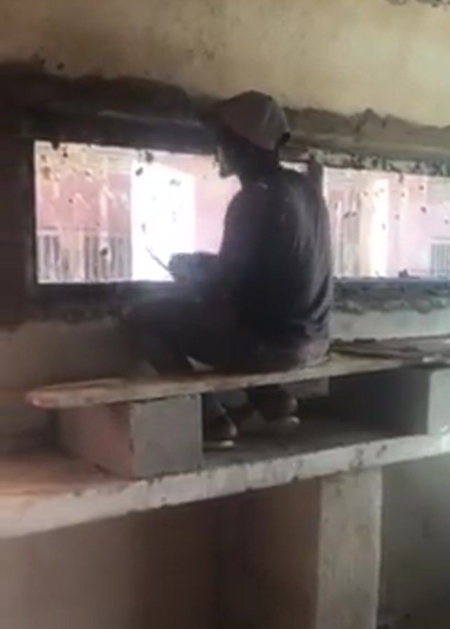 A man in a baseball cap, dark shirt, and pants is sitting cross-legged on a wooden plank that is supported by concrete blocks. He appears to be applying some type of sealant or mortar around the edges of a rectangular window frame using a trowel. The window looks out onto a building exterior with red brick accents. The room itself appears to be under construction, with unfinished concrete walls and visible supports. There is a concrete shelf-like structure beneath the plank where the man is sitting.