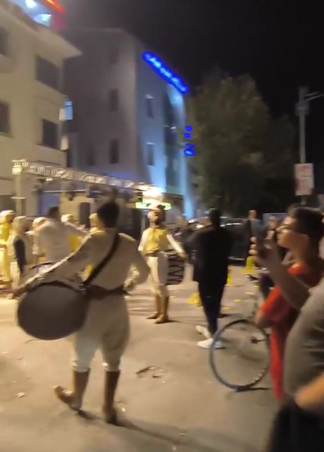 At night, a group of men are gathered on a street, some wearing traditional attire with boots and carrying large drums. They seem to be performing, as there is also a stage with lighting behind them. Several people in the crowd are holding up their phones, recording the event. The backdrop includes buildings with signs in a different language and streetlights, indicating an urban setting.