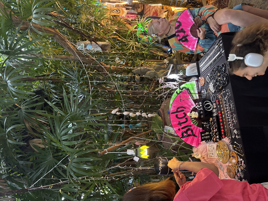 The image depicts an outdoor night market stall in Moo 1, Thailand, illuminated by numerous string lights draped across dense green foliage and tree branches. Three individuals are visible. On the left, a person with shoulder-length brown hair, wearing a pink t-shirt, stands behind a black-draped table, actively handling a silver-colored necklace. The table displays a wide assortment of jewelry, including rings, bracelets, necklaces, and earrings, arranged on various stands, trays, and a pink faux-fur surface. Prominently featured on the table are two large, neon pink and green handheld fans, one clearly displaying the word "Bitch" in black text, and another with "AJ0". In the mid-ground, a blonde-haired individual with a white flower in their hair and a black choker, wearing a colorful patterned kimono-style garment, sits holding a similar pink fan. This person looks to the right, away from the table. In the lower right foreground, partially visible, a third individual with curly brown hair wears white over-ear headphones and smiles or laughs, looking to the left. The background features large potted plants, decorative elements like hanging feathered ornaments, a multi-colored lantern, and a group of seated stone Buddha statues.