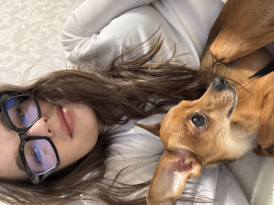 An indoor photograph taken in Chaikovsky, Russia, depicts a woman and a small dog. The woman, occupying the upper half of the frame, has long, dark brown hair and wears black, cat-eye style eyeglasses, which exhibit a blue light reflection. Her eyes are visible behind the lenses, and her lips appear light pink and glossy. She is dressed in a light-colored, ribbed long-sleeved top. A small, short-haired dog, with reddish-brown fur, large dark eyes, a black nose, and erect, pointed ears, is positioned in the lower half of the frame, resting alongside the woman. The dog's gaze is directed towards the right. The background consists of a light-toned wall featuring a subtle, embossed floral or scroll pattern.