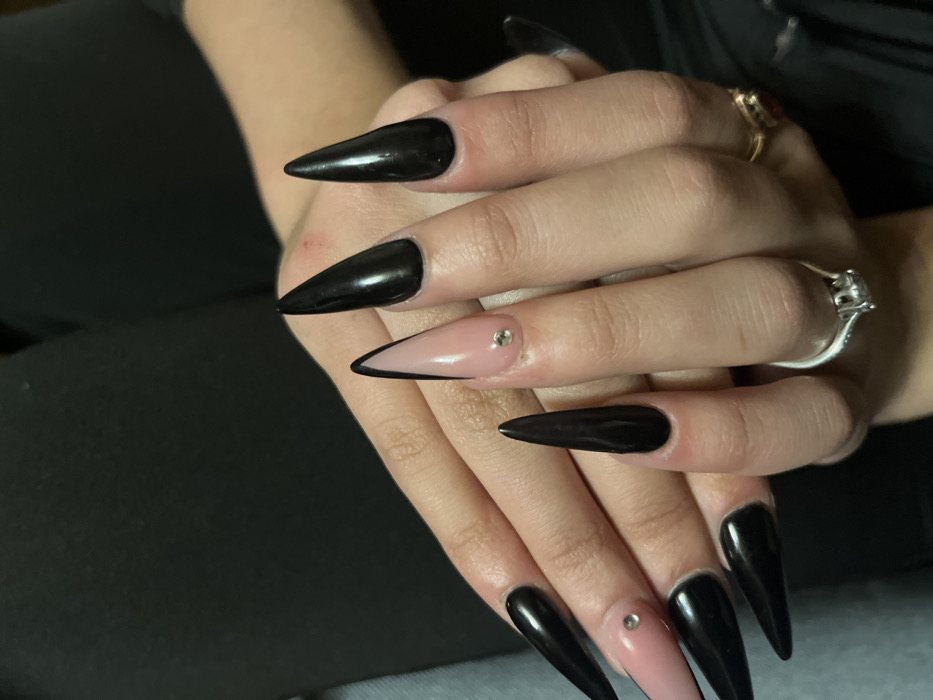 A woman's hands are displayed, showcasing long, pointed stiletto nails. Most are painted a glossy black, while two have a nude base with a black outline. Small, circular rhinestones adorn the nude nails near the base. Two rings are visible: one with a large stone and the other appearing to be a gold ring with a darker gem. The background is dark and blurred, drawing focus to the hands and their manicured nails.