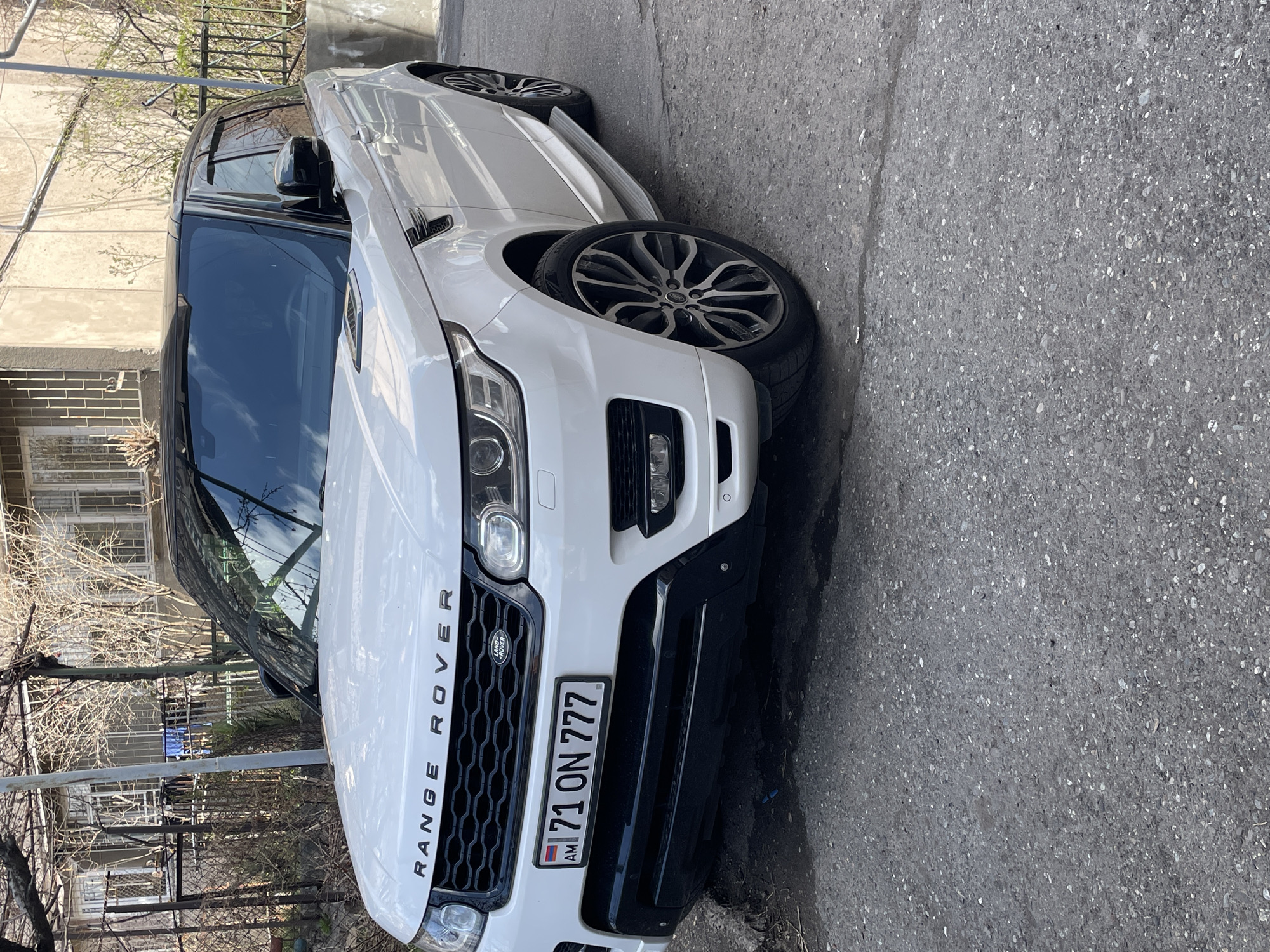The image depicts a white Range Rover Sport parked on a paved street in Yerevan, Armenia. The vehicle is positioned at an angle to the camera, showcasing the front end. The license plate, "71 ON 777," is visible. The surrounding environment shows a residential area with buildings and bare trees, suggesting it may be late fall or winter. The pavement appears to be asphalt or concrete. There are no people visible in the immediate frame.