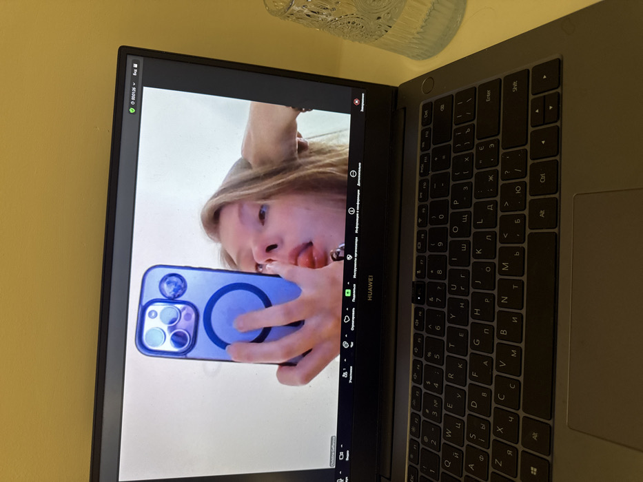 The scene depicts a HUAWEI laptop positioned on a light-colored surface, likely a desk. The laptop screen displays a video conference interface, resembling Zoom, showing a young woman captured in a selfie. The woman has light-colored hair, appears to be looking upwards, and is sticking out her tongue. Her left hand holds a blue-cased iPhone, likely an iPhone Pro model due to the prominent triple camera array and a visible circular MagSafe ring on the case's rear. A small, spherical, blue-toned embellishment is affixed near the phone's cameras. The video call interface shows a participant name "Christina Galtarova" in the bottom left corner and a timer displaying "00:01:26" with a green checkmark in the top right. The laptop's keyboard features both Cyrillic and Latin characters. To the right of the laptop, a textured, clear glass containing a small amount of liquid is present. A plain yellow wall serves as the background above the laptop and to its right. The location within Chiang Mai City Municipality, Thailand, cannot be determined from the visual information present in the image.