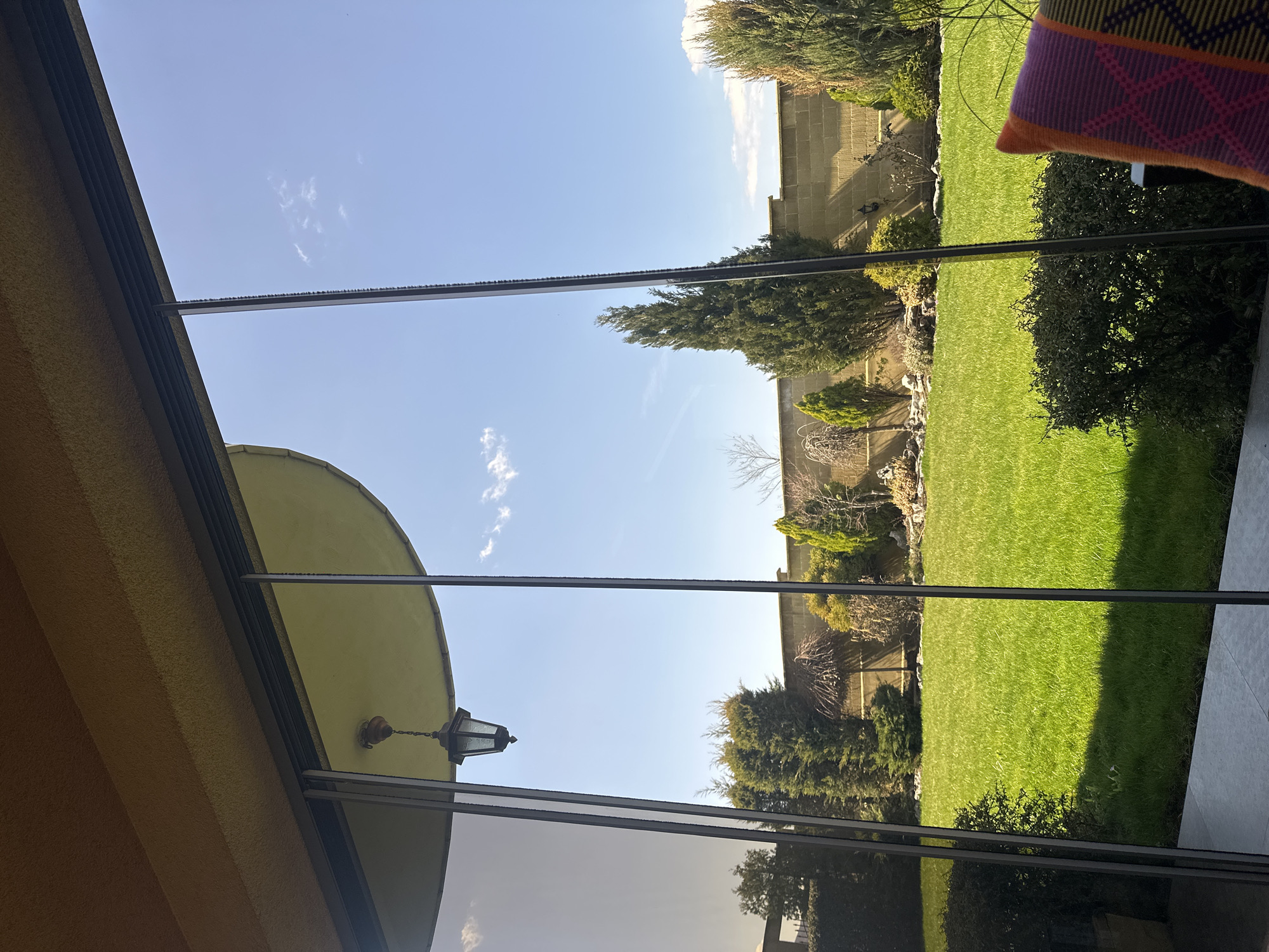 view of a garden from inside a building. The garden has a lawn, trees, and a wall in the background. A pillow is visible on a chair in the right of the frame. The image is taken through a glass window, which reflects the sky. A lamp is visible on the building exterior. The precise location in the city of Sofia, Bulgaria cannot be determined from the image.