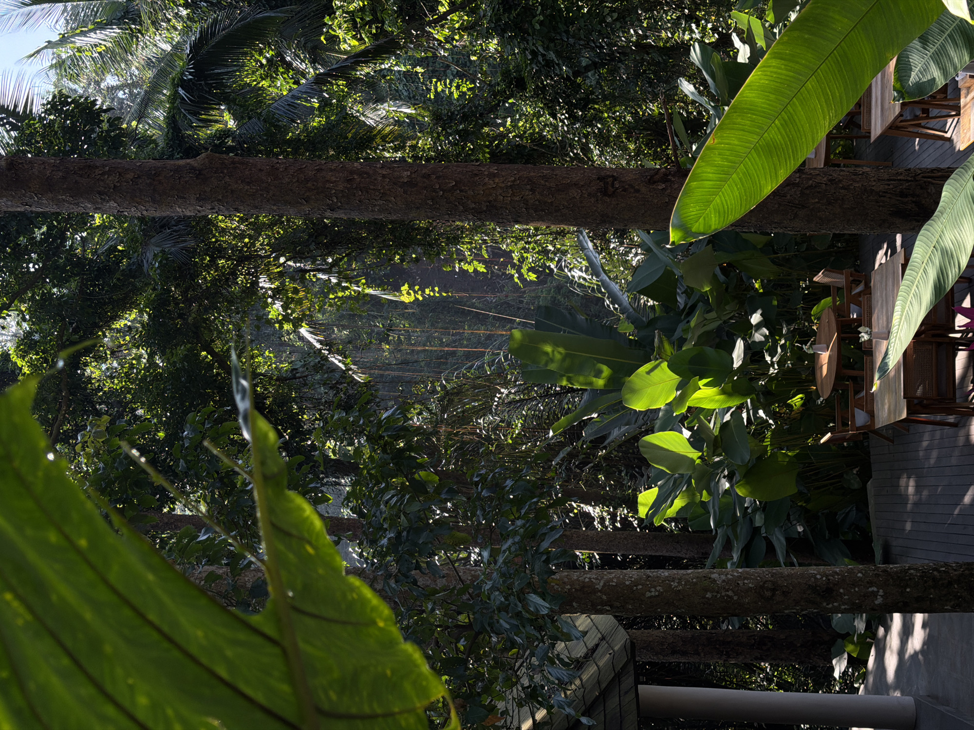 view in Kedewatan, Indonesia. Trees are prominent throughout the scene. A building with a wooden deck and furniture is visible. Large leaves are in the foreground. Sunlight filters through the foliage.