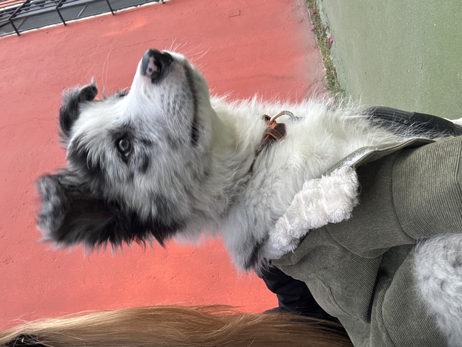 A fluffy, gray and white dog looks upward with a cute, inquisitive expression. The dog wears a brown collar. A jacket with a faux fur collar is draped over the dog's body. The background is an outdoor setting, with a blurred red wall on one side and green grass or foliage on the other. Human hair appears in the foreground at the bottom.